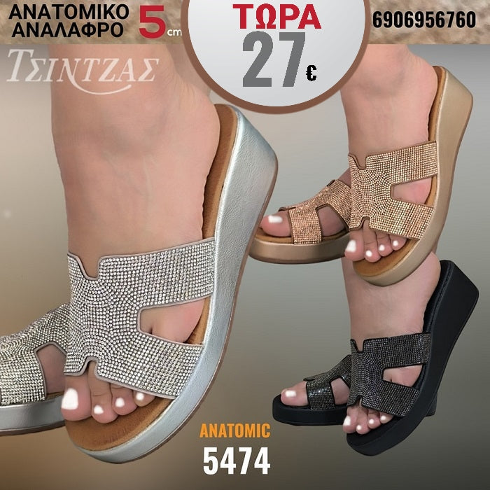 Anatomic 5474 - Παντόφλες πλατφόρμες με στράς που χαρίζουν λάμψη και ξεχωριστό στυλ σε κάθε σας εμφάνιση. Ο ανατομικός τους πάτος προσφέρει άνεση και στήριξη, καθιστώντας τις ιδανικές για πολύωρη χρήση χωρίς καταπόνηση. Με ύψος τακουνιού 5 εκ., εξασφαλίζουν κομψότητα και σταθερότητα στο βάδισμα. Ο μοντέρνος σχεδιασμός τους συνδυάζει την πολυτέλεια με την πρακτικότητα, κάνοντάς τες ιδανική επιλογή για όλες τις ώρες της ημέρας.