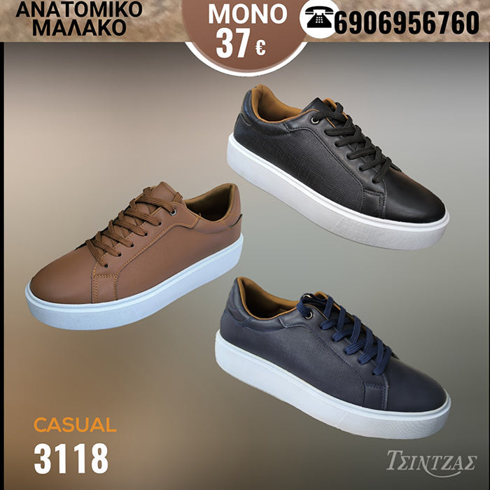 Το Casual 3118 ανδρικό παπούτσι είναι ανατομικό και μαλακό, προσφέροντας άνεση και στήριξη στα πόδια σας. Είναι ιδανικό για καθημερινή χρήση και διαθέτει ανατομικό πάτο που προσαρμόζεται στην φυσιολογική καμπύλη των ποδιών σας, προσφέροντας άνεση κατά το περπάτημα.