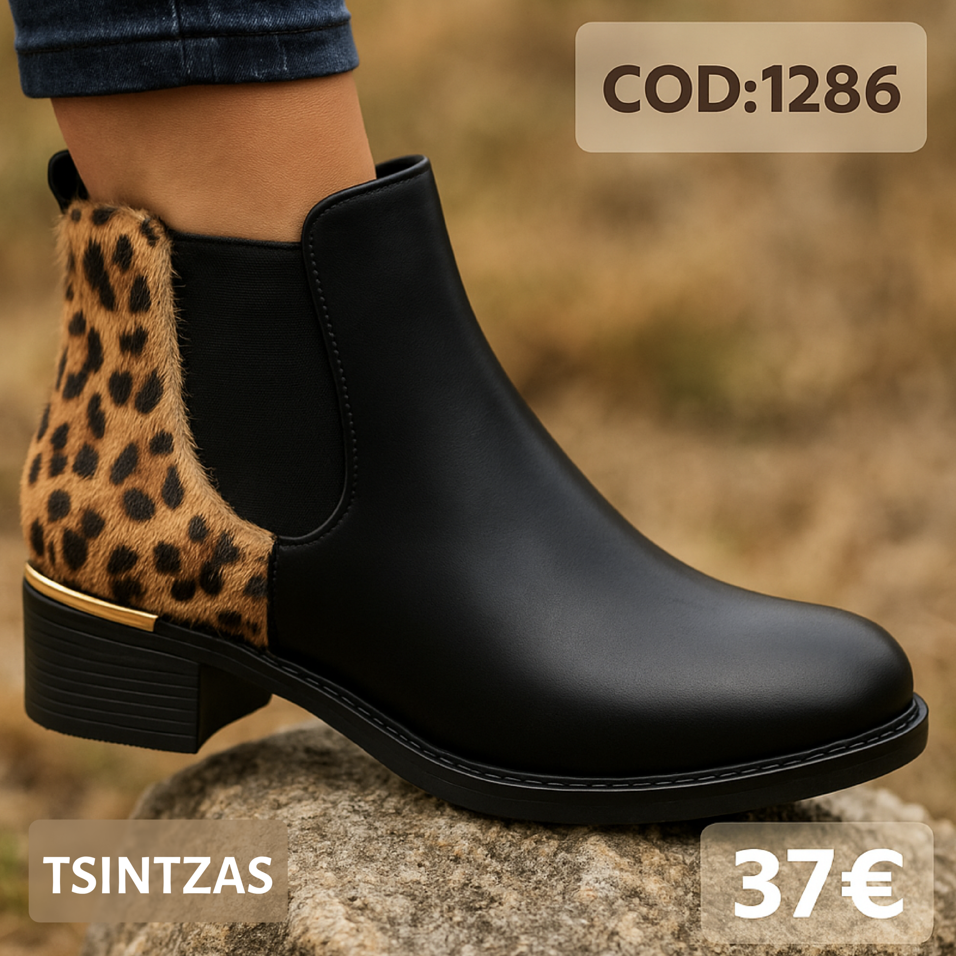 Τα Booty 1286 Αυτά τα κομψά γυναικεία μποτάκια σε μαύρο δέρμα, με λεπτομέρεια animal print στο πίσω μέρος και χαμηλό σταθερό τακούνι, συνδυάζουν στυλ με καθημερινή άνεση. Ο εσωτερικός ανατομικός πάτος προσφέρει ξεκούραστο περπάτημα όλη μέρα.