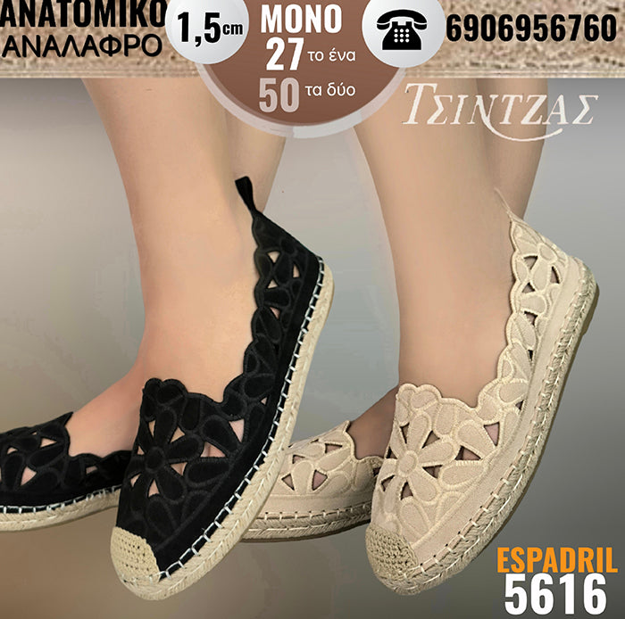 Οι Espadril 5616 αποτελούν την ιδανική επιλογή για άνετη και στυλάτη καλοκαιρινή εμφάνιση. Με ανατομικό πάτημα, τρυπητό σχέδιο και ύψος 3 εκατοστών, αυτές οι εσπαντρίγιες συνδυάζουν άνεση και μοντέρνο στυλ. Φόρεσέ τις για χαλαρές καλοκαιρινές εξορμήσεις με την εγγύηση των Υποδημάτων ΤΣΙΝΤΖΑΣ.