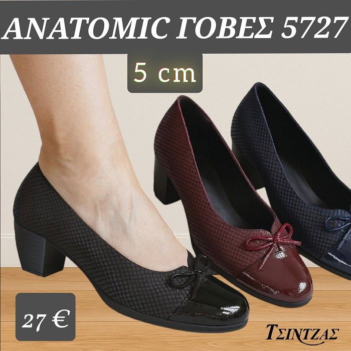 Αυτές οι γόβες μεσαίου τακουνιού (5cm) συνδυάζουν κομψότητα και άνεση χάρη στον ανατομικό τους πάτο. Έχουν διακριτική υφή στο ύφασμα, λουστρίνι λεπτομέρεια στη μύτη και μικρό φιόγκο που χαρίζει θηλυκότητα. Διατίθενται σε μαύρο, μπορντό και μπλε.